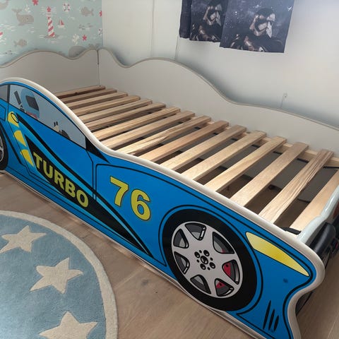 Juniorseng i bilform i rød farge. Sengen er utformet som en racerbil med trykte detaljer på sidene og felglignende hjulmotiv. Den har sengebunn med lameller for madrass i juniorstørrelse. Passer til barn som har vokst ut av sprinkelseng og over i juniorseng.