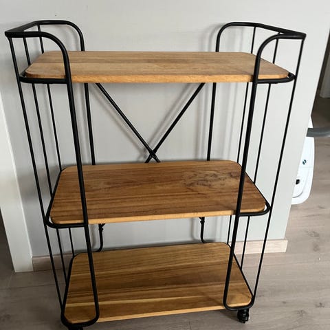 Hylle på hjul i industriell look i tre og metall fra Bohus. Hjulene kan låses. Hylla er ferdig montert. Hentes i Moss.