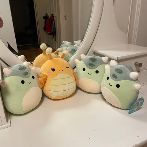Squishmallows kosedyr formet som en bie. Med grønn hatt og striper på magen.