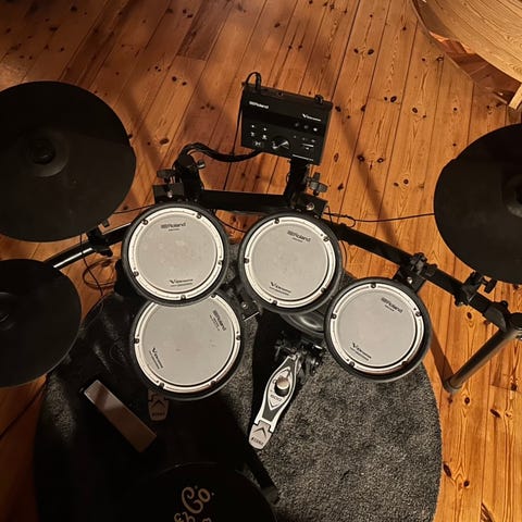 Et arbeidsjern av et trommesett produsert på 80-90-tallet.