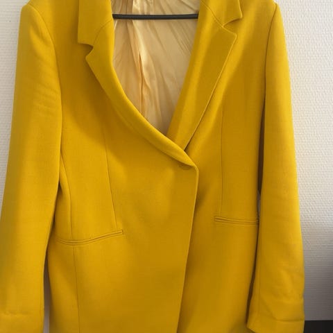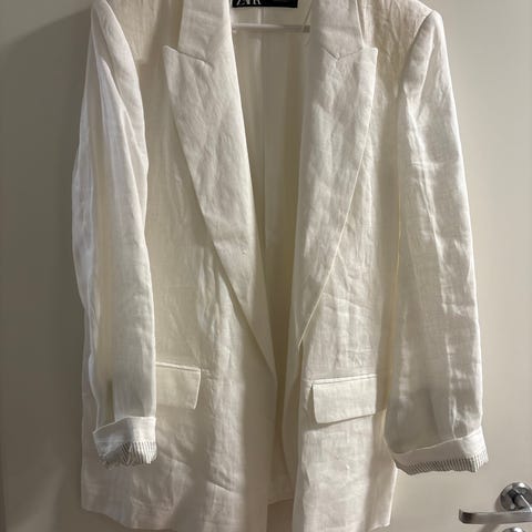 Zara blazer for dame i størrelse L. Blazeren er laget av lin og viskose. Normal bruksslitasje, noe slitt i krage på innsiden, vises ikke og kan muligens vaskes.