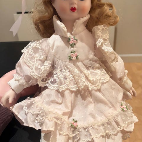 Pen og søt porselensdukke utformet som baby, kledd i hvit dåpskjole med blonder og sløyfer. Dukken har myk kropp med armer, ben og hode i porselen og ligger på et matchende babyteppe med blondekant. Ansiktet har malte øyne og munn. Klærne består av kjole, hette og truse i hvit tekstil med dekorative blonder. Egnet som pyntedukke eller samleobjekt.