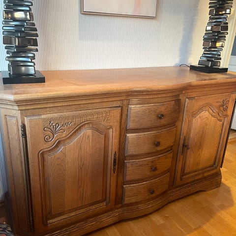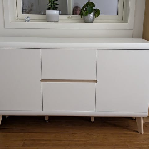 Sjenk kjøpt fra skeidar. 180cm lang hvit med hvitmalt eik på ben og som håndtak