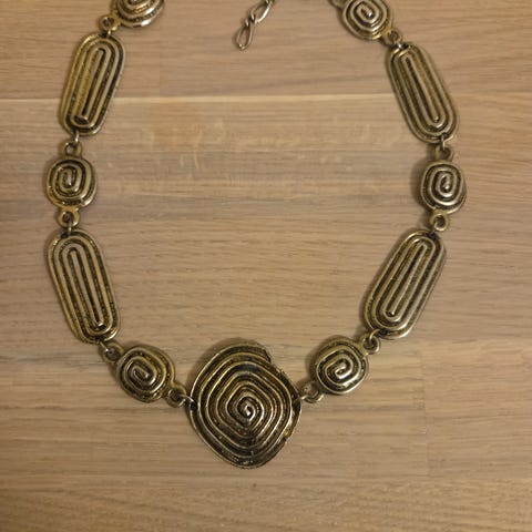 Smykket består av ulike deler som ligger i en vifte form, så former seg pent rundt halsen. Noen av delene har blanke stener/strass.