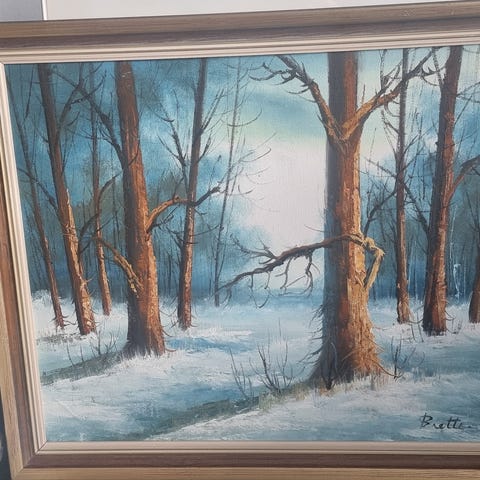 Landskapsmaleri bilde i rosa og grå toner. Motiv med trær, vann og skog i bakgrunnen. Passer som veggdekor i stue, soverom eller gang. Maleriet har et stemningsfullt og naturinspirert uttrykk med dempede farger. Lerret, akryl, 59×61.