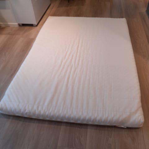 Den er brukt med en madrassebeskytter (Care madrassbeskytter 180x200 cm hvit fra KID). Madrassebeskytteren følger med hvis ønskelig. Den ene strikken røk dessverre, se bilder.
