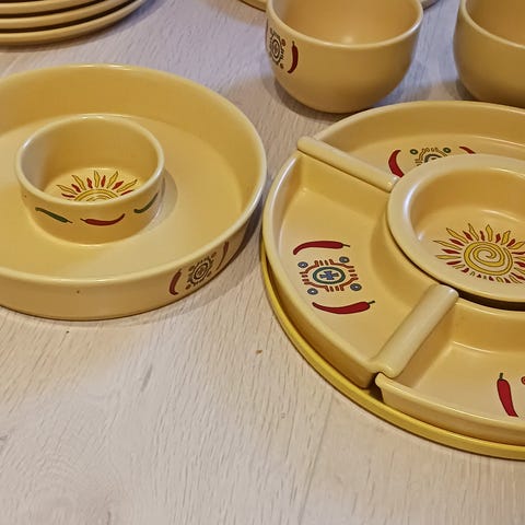Sagaform serveringssett i gult keramikk. Settet består av flere deler: 6 stk middagstallerkener, 4stk skåler på snurrende brett, 1 stor salat/chipsbolle, samt 5 stk skåler som står sammen på et plasteret. Perfekt til tacofredag!