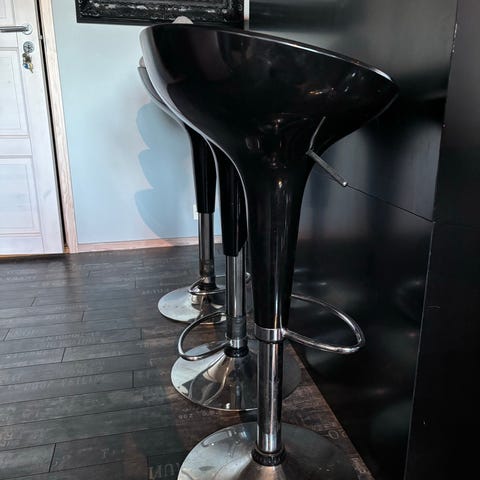 Sammenleggbare barkrakker. Én helsvart, én med ben i metall. Med fotstøtte. Pent brukte.