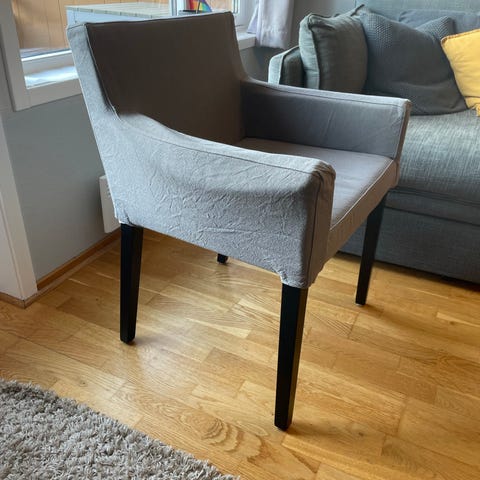4 stk behagelige stoler til spisebord fra Ikea, av modellen "Norman". God brukte, med en del flekker og nupper i trekket, men fult funksjonelle og fortsatt masse stol igjen. Perfekt til et kollektiv, eller for den som ønsker å trekke om!
