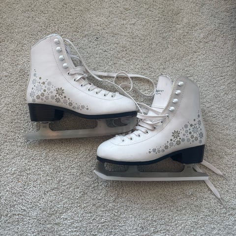 Pro Flyer kunstløpskøyter for barn i størrelse 38. Hvit modell med snøkrystall-motiv på siden. Klassisk snøring med lisser og hemper for god tilpasning rundt ankelen. Skøytene har stålklinge med tagger foran, egnet til kunstløp og lek på isen. Mykt, polstret fôr på innsiden for økt komfort ved bruk. Passer til barn som trenger skøyter i størrelse 38.