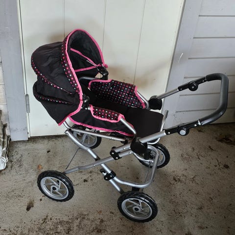 Pent brukt dukkevogn i merket Brio. Mørk blå med hvite og rosa detaljer. Med trekk, madrass og nett. Hele og forsiktig brukt. Må hentes på Borgenhaugen, Sarpsborg.