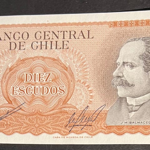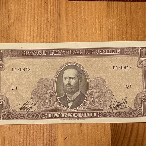 Banco Central de Chile 100 escudos seddel. Forsiden viser portrett og påskriften «Banco Central de Chile» og «Cien escudos». Baksiden har motiv av seilskip og teksten «Banco Central de Chile» og «Cien escudos». Passer for samlere av utenlandske pengesedler og numismatikk.