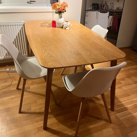 Bordet er fint, men noen få hakk. Og setene i stolene bærer preg av bruk, typ misfarging og skrap. Kan også selges hver for seg.