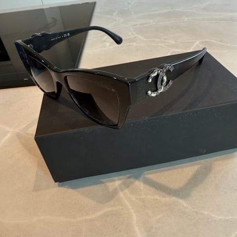 Chanel solbriller for dame i svart innfatning. Modellen har ovale glass med mørke, graderte linser og tydelig Chanel-logo på stengene. Leveres med hardt etui med vattert mønster og Chanel-logo, samt pusseklut. Egnet som moteriktige solbriller til hverdagsbruk og reise.
