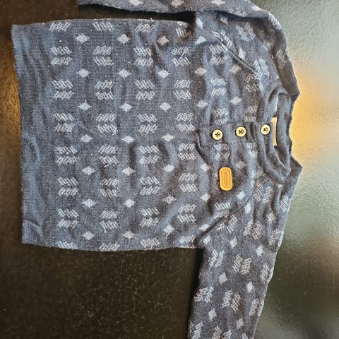Pent brukt mellom ullsett. Genser har en liten grønn prikk på baksiden av armen.