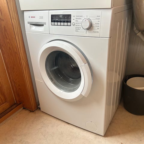 Bosch frontmatet vaskemaskin i god stand. Maskinen har frontåpning med glassluke og betjeningspanel med dreiehjul og display på toppen. Egnet for plassering under benk eller frittstående i vaskerom eller bad. Passer til vanlig husholdningsbruk for vask av klær og tekstiler.