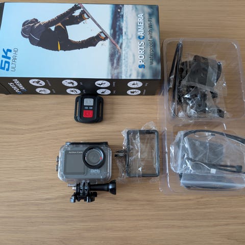 INF 4K Sports Ultra HD DV actionkamera med 4K-oppløsning og WiFi. Kameraet er vannbestandig ned til 30 meter og egner seg til bruk i ulike utendørsaktiviteter. Støtter minnekort opptil 64 GB. Leveres med ulike festebraketter og tilbehør for montering på for eksempel hjelm eller sykkel.