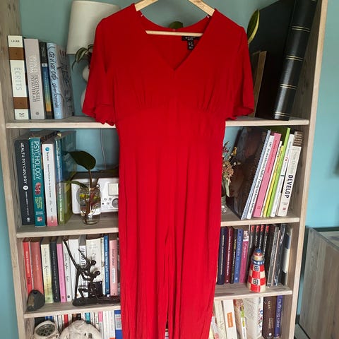 H&M hverdagskjole for dame i størrelse M. Kjolen er rød og laget i polyester. Modellen har omslagseffekt med knyting i livet og korte ermer. Egner seg som enkel hverdagskjole eller til uformelle anledninger.