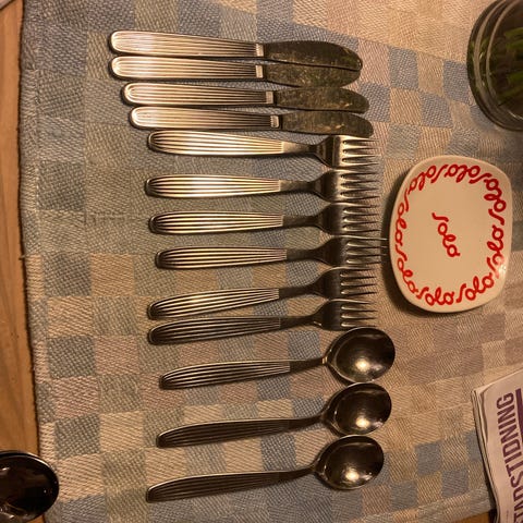 Hackman bestikksett i rustfritt stål med kniver, gafler, spiseskjeer og teskjeer. Bestikket leveres i et rektangulært etui/trekasse med innredning som holder delene på plass. Egnet til servering i hverdag og til selskap. Antall deler og nøyaktig modellnavn er ikke oppgitt. Mangler en teskje.