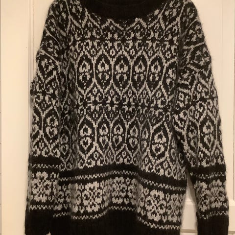 Håndstrikket ullgenser med rundt bærestykke i flerfarget mønster. Genseren er strikket i mørk blå bunnfarge med mønster i lyse og grå toner øverst på bol og ermer. Klassisk rund hals og lange ermer. Passer godt som varm villmarksgenser eller hverdagsgenser til bruk på kjølige dager. Strikket i lamaull. Str L/XL