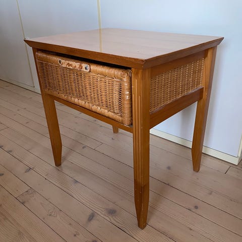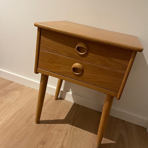 Fantastisk design fra 50 - 60 tallet. Helt stabil og lett å åpne skuffer. Overflaten bør behandles.