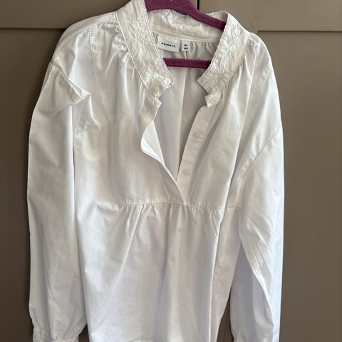 I tillegg følger det med en hvit bunadsskjorte, men anbefaler å eventuelt kjøpe ny, med mindre du kan sy. Har revnet fra brystet og ned i fronten.