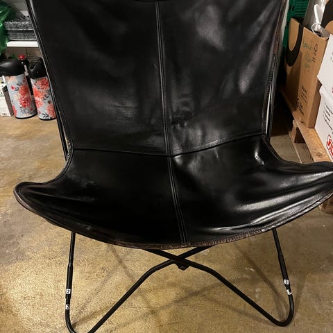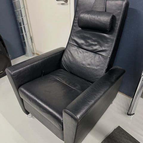 Denne behagelige stolen er perfekt for en lesekrok. En katt har dessverre laget noen spor med klørne, de kan kanskje skjules med en tusj for skinn i riktig farge.