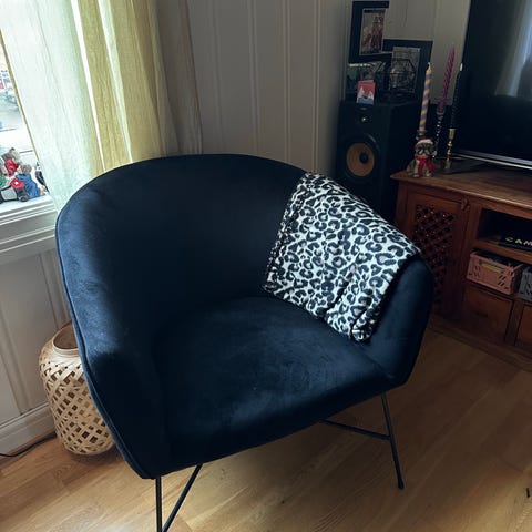 Behagelig, lettplassert lenestol i moderne design. Ben av metall, trekk av fløyel og fyll av polyeter. Martindale >100 000 omganger.
