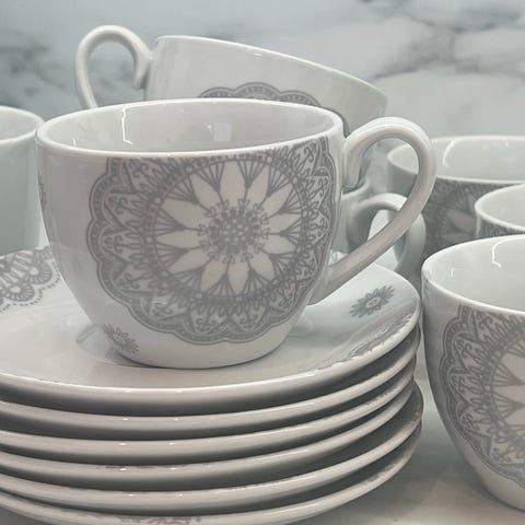 Jysk kopp og asjett i porselen med blått og hvitt mønster. Settet består av kopper med hank og tilhørende asjetter i samme dekor. Egnet til servering av kaffe, te eller annen varm drikke med kake eller tilbehør. Klassisk blå-hvit dekor gjør at serviset kan kombineres med annet hvitt eller blått servise på kjøkken eller spisestue.