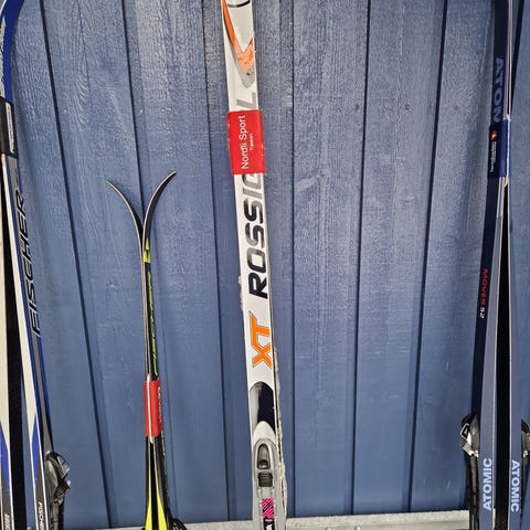 langrennski rossignol med Rottefella-bindinger og tilhørende staver i blå farge.