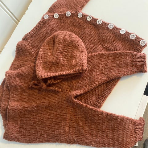 Selger et flott hjemmestrikket ullsett i str. 56/62. Settet er ikke brukt, kun vasket.