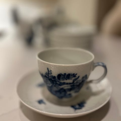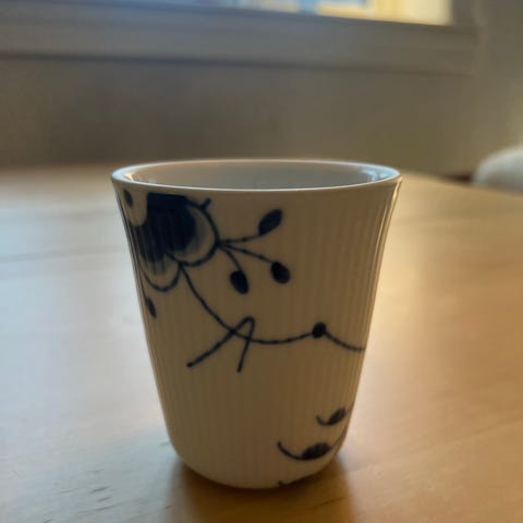 Royal Copenhagen krus/telysholder i porselen med blå-hvitt mønster. Egner seg til varme (Espresso) og kalde drikker ved borddekking til hverdag og selskap. Designet gjør at krusene kan kombineres med annet servise fra Royal Copenhagen i lignende blå-hvite serier