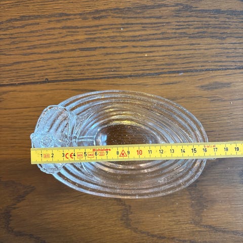 Selger en liten, solid glassform fra Arcoroc (Frankrike). Formen er laget i slitesterkt, klart glass med dekorativ riflet bunn og sirkelmotiv i midten. Perfekt til små gratenger, tapas, desserter eller servering.