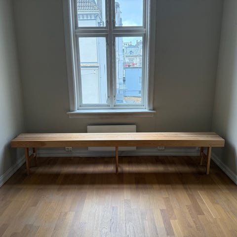 Benk gis bort. Har kun vært brukt som pynt, da ett av beina er reparert flere ganger og derfor ikke tåler å sitte på.