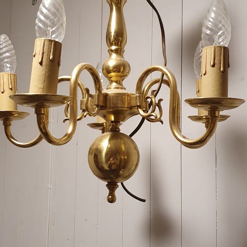 Pent brukt messing lysekrone som har vært i mitt eie i ca 10 år. Fungerer helt fint. Selges pga fornying😊