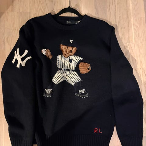 Ralph Lauren genser for herre i størrelse S. Genseren er laget av bomull og har mørk blå farge. På fremsiden er det et stort strikket motiv av en bjørn i baseballantrekk, og på den ene armen er det et kontrastbrodert emblem. Rund hals og ribbestrikkede kanter nederst og på ermene. Egner seg til hverdagsbruk og fritid i kjøligere vær.