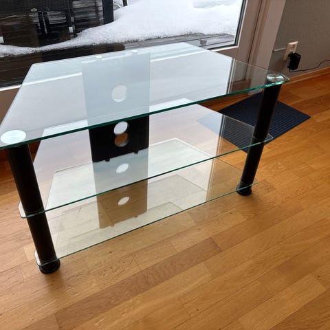 TV-benk i mørk brun trefinish med tre hyller. Benken har to åpne mellomhyller med metallfargede søyler mellom nivåene og en større hylle nederst. Åpen bakside gir plass til kabler. Egnet for TV, medieutstyr og oppbevaring av tilbehør i stue eller TV-rom.