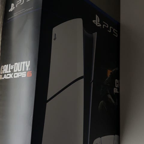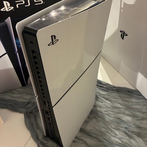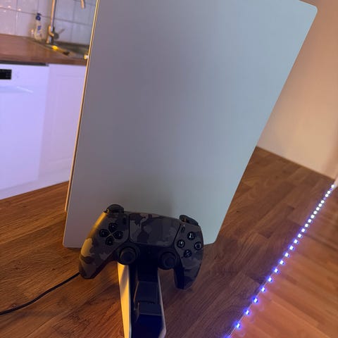 Sony Playstation 5 spillkonsoll i hvit farge. Konsollen har avtakbare sideplater, hvor den ene platen har klistremerker påført. Standard tilkoblingsmuligheter for PS5 med USB-porter og HDMI på baksiden. Egnet for bruk med kompatible Playstation 5-spill og tilbehør.