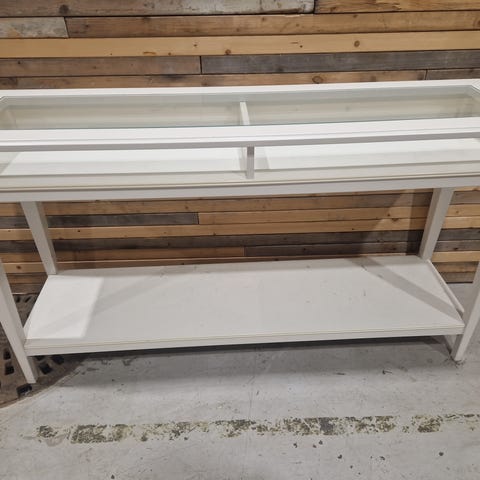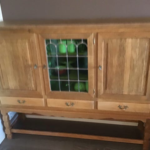 Romslig skjenk i eik selges mot henting. Masse plass i de tre skapene som er oppdelt med glasshyller. Tre dype skuffer som er perfekt til stearinlys, bestikk, servietter, duker etc. Noen bruksmerker på topplata som kan fikses med litt pussing og olje. Mål: 159 bred/lang, 42 dyp, 78 høy.