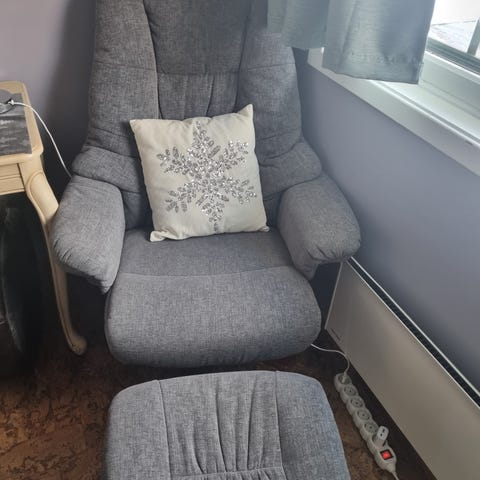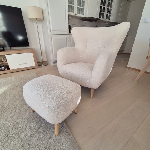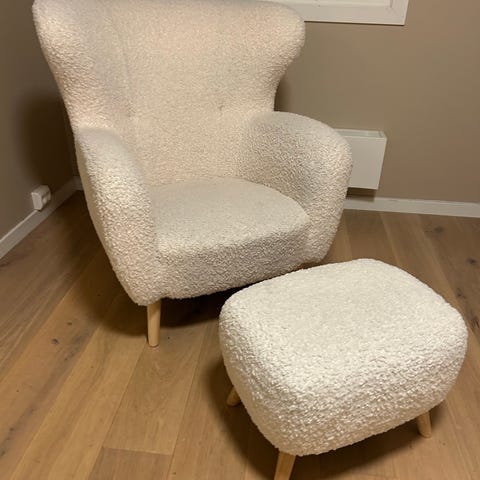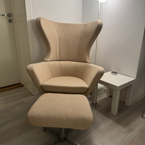 Lenestol med krakk i lys beige tekstil. Lenestolen har høy rygg og avrundede armlener som gir god støtte. Krakken har samme tekstil og ben som stolen, og fungerer som fotskammel. Begge deler står på lyse treben som gir et nøytralt uttrykk som passer inn i de fleste stuer og oppholdsrom. I utmerket stand :)
