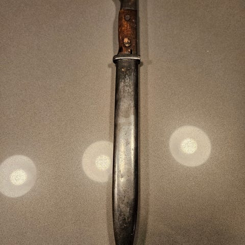Hel og grei bajonett selges. Lengde 70 cm (bladlengde 57 cm). En del overflaterust, se bilder.