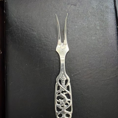 Antikk sølv gaffel med fire tinder og klassisk skaftform. Gaffelen har inngravert stempling på skaftet som angir opprinnelse og sølvinnhold. Egner seg som bestikkdel eller samleobjekt innen eldre sølv- og bruksgjenstander.