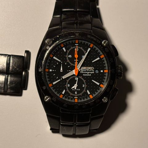 Klokken har sort urskive med tydelige hvite markeringer og datovisning.