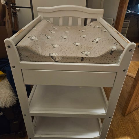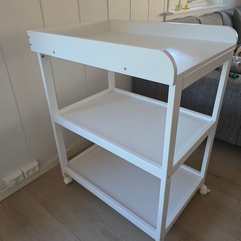JLY Dream Stellebord. Hvit farge. Mangler skuffen, men den har ikke vært et savn hos oss. Satt på stang med kroker og bokser på den ene siden. Selges UTEN stellematte.