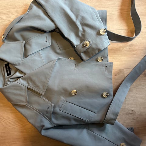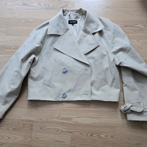Lekker MEOTINE trenchjakke for dame i merket størrelse M/L. Jakken er i beige bomull og har klassisk trenchdesign med dobbeltspent knepping, krage og skulderklaffer. Den har belte i livet, lommer i sidene og detalj med strikk i ryggen for bedre passform. Lengden går omtrent til hoftene, og passformen er rett med lett romslige ermer.