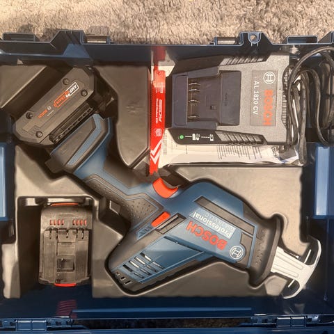 Dette er akkurat samme sliperen og batteriene som Bosch Professional, bare med mye mer utstyr.