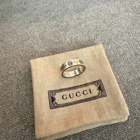 Selger en ekte Gucci ring i 925 sterling sølv med sort emalje og ikonisk GG-logo.