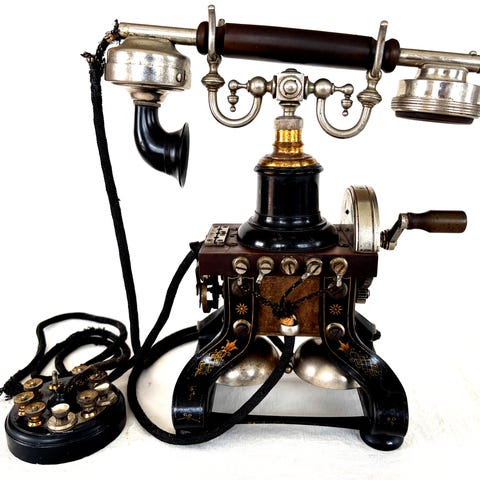 Selger en veggtelefon fra 1890-tallet. Produsert av Elektrisk Bureau, Kristiania.