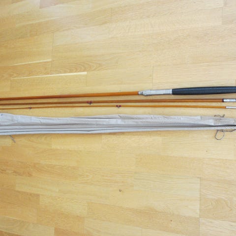 GAMMEL fiskestang i tre (teak?..) i fire (fem) deler, lengde ca 4,10 m selges.