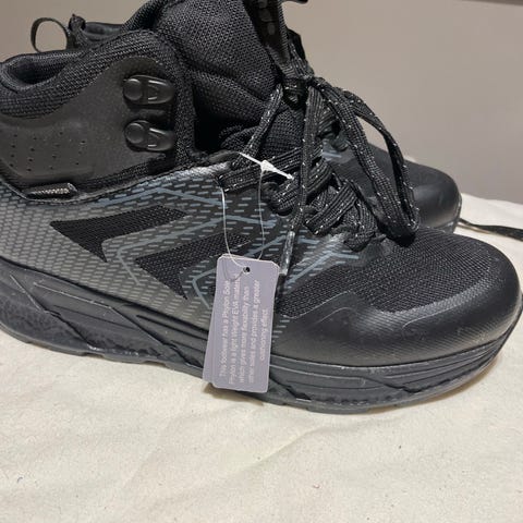 Dr. Martens AirWair tursko i størrelse 39. Skoene har grå overdel i tekstil med sort snøring og polstret kant rundt ankelen. Yttersålen er i gummi med grovt mønster for bedre grep. Modellen er ankelhøy og egnet til fottur og hverdagsbruk på variert underlag.